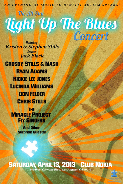 The 2nd Light Up The Blues concert to benefit Autism Speaks, hosted by Kristen and Stephen Stills, will take place on April 5th at The Theatre at Ace Hotel in downtown Los Angeles. The sold out concert will feature Crosby, Stills & Nash, John Mayer, Don Felder, Brandi Carlile, and Chris Stills. Also performing are special guests―rapper Watsky, indie artist Xolie Morra and The Strange Kind, Rio “Soulschocka” Wyles, Adam Mandela Walden, and Neal Katz.